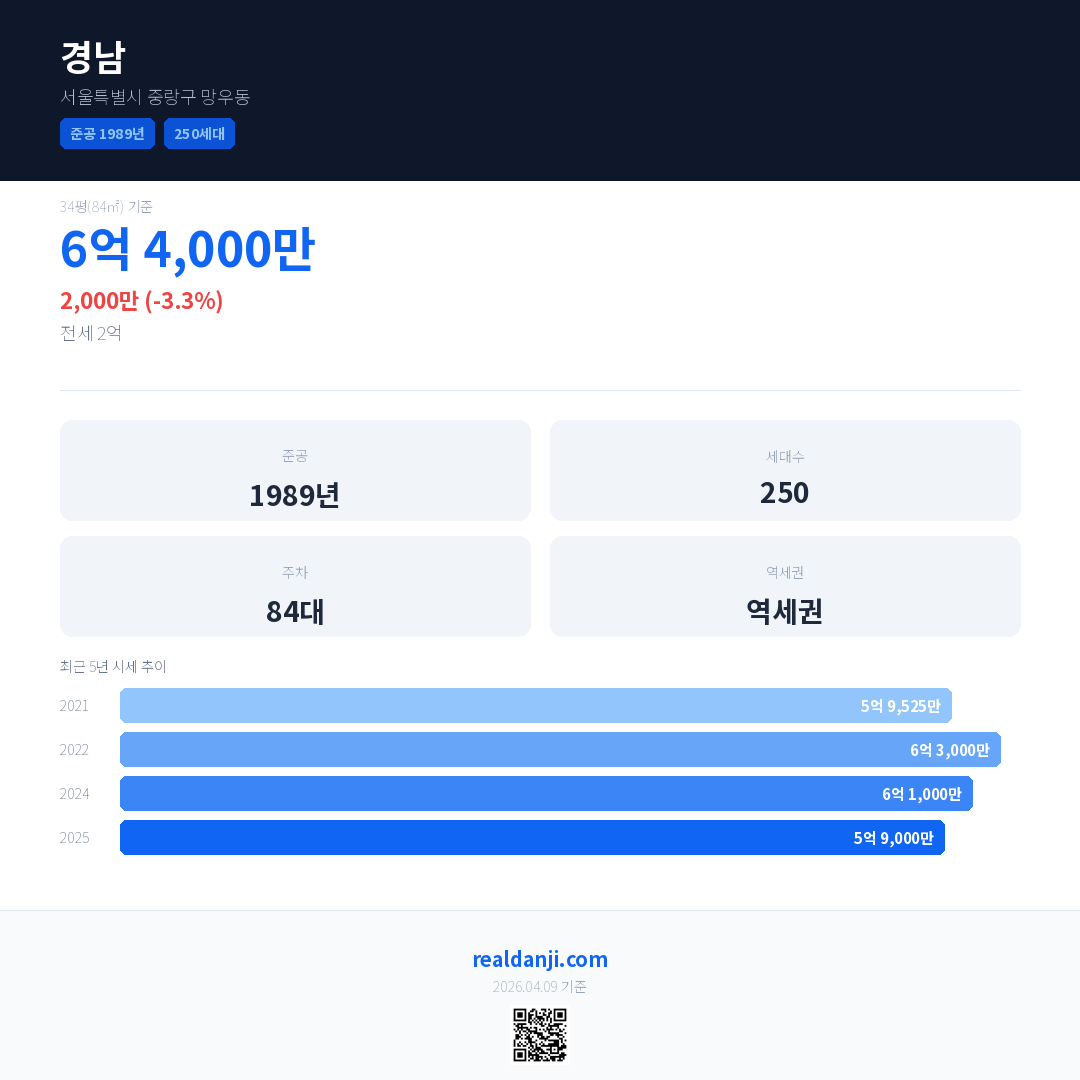 경남 국민평형 기준 2025년 평균 거래가는 5억 9,000만으로, 전년 대비 3.3% 하락 했습니다.