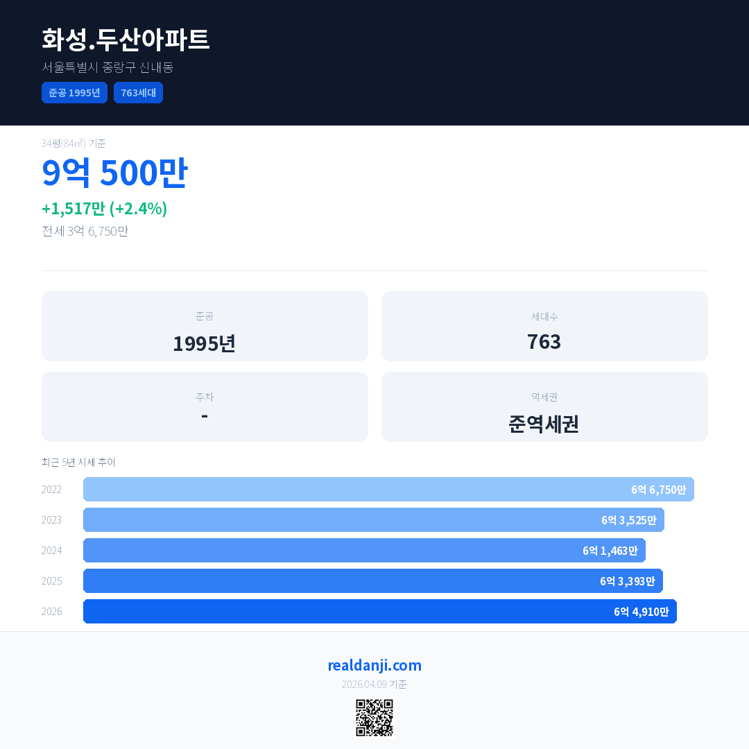 화성.두산아파트 최근 거래가는 9억 500만입니다. (2026-04)