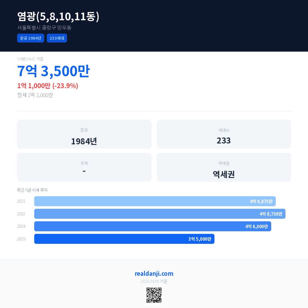 염광(5,8,10,11동) 국민평형 기준 2025년 평균 거래가는 3억 5,000만으로, 전년 대비 23.9% 하락 했습니다.