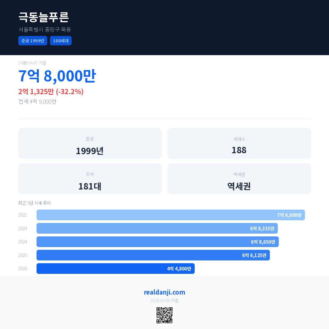 극동늘푸른 국민평형 기준 2026년 평균 거래가는 4억 4,800만으로, 전년 대비 32.2% 하락 했습니다.