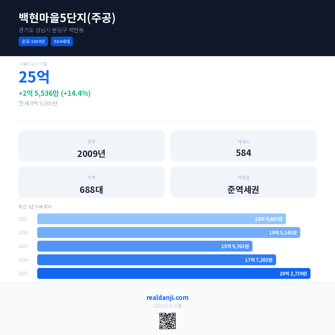 백현마을5단지(주공) 최근 거래가는 20억입니다. (2025-10)