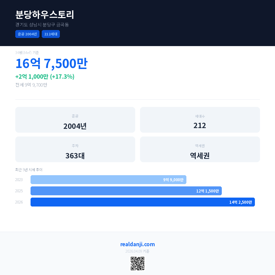 분당하우스토리 최근 거래가는 16억 7,500만입니다. (2026-03)
