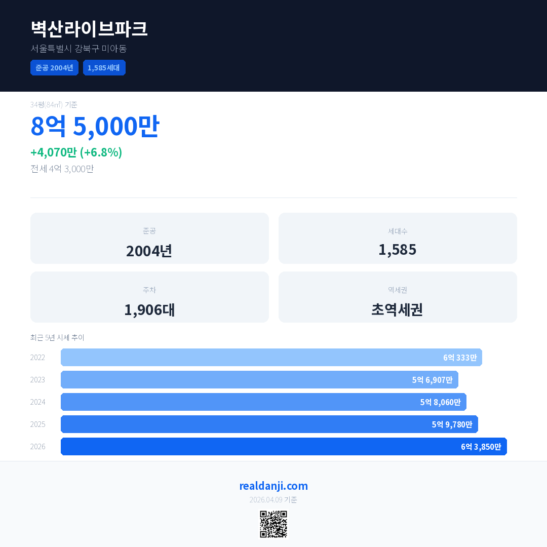 벽산라이브파크 국민평형 기준 2026년 평균 거래가는 6억 3,850만으로, 전년 대비 6.8% 상승 했습니다.