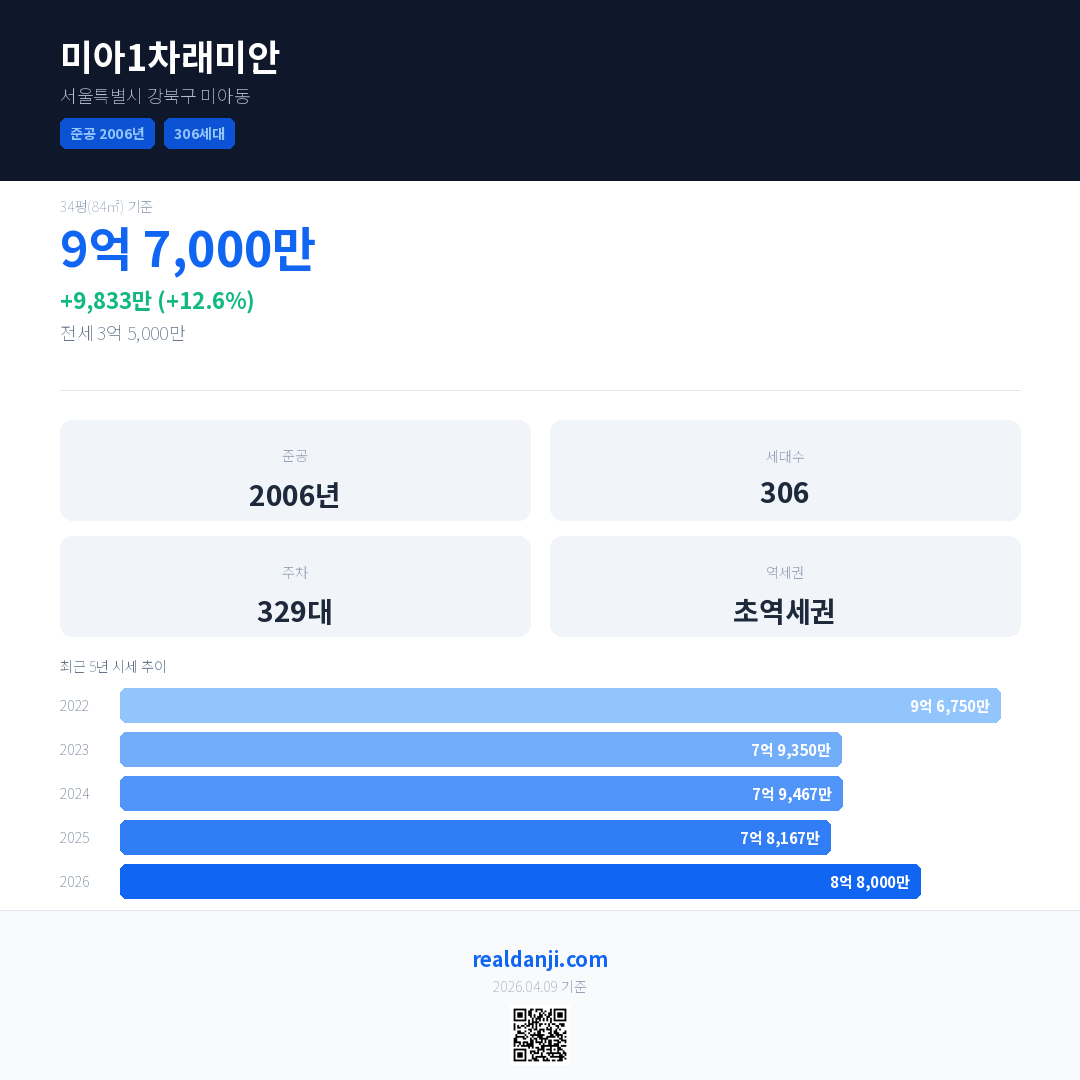 미아1차래미안은(는) 2006년에 준공되었으며, 현재 20년차입니다. 총 306세대 규모입니다.