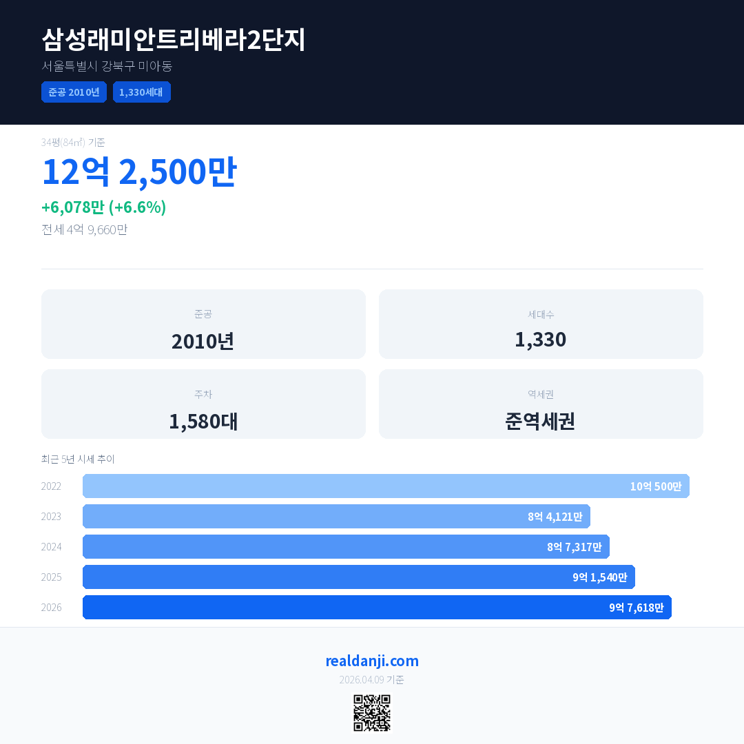 삼성래미안트리베라2단지 최근 거래가는 12억 2,500만입니다. (2026-03)