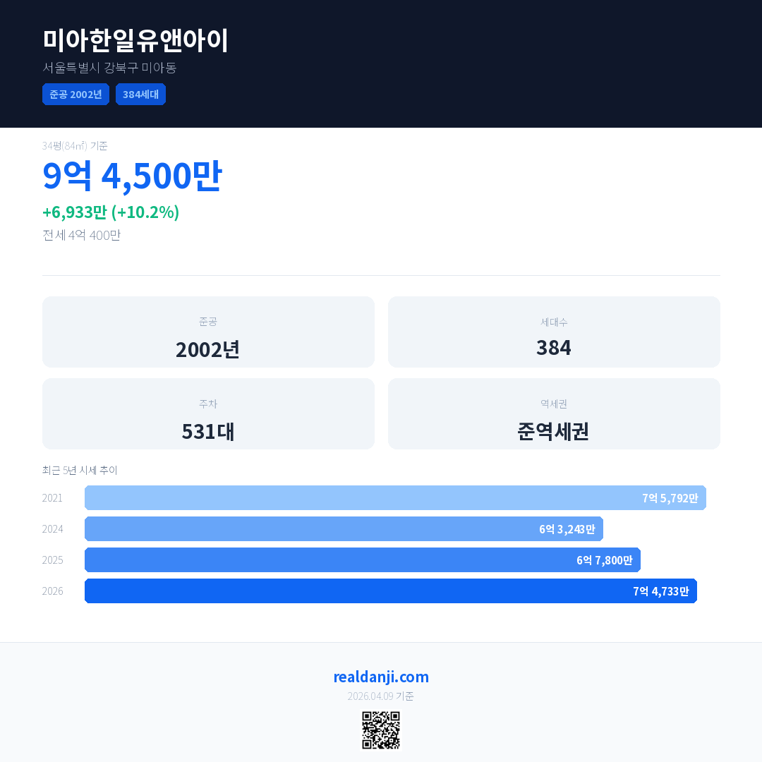 미아한일유앤아이 국민평형 기준 2026년 평균 거래가는 7억 4,733만으로, 전년 대비 10.2% 상승 했습니다.