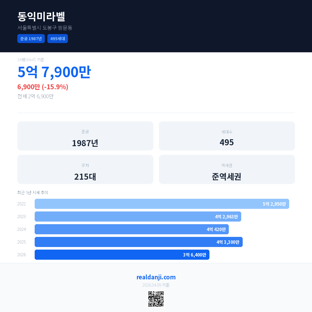 동익미라벨 국민평형 기준 2026년 평균 거래가는 3억 6,400만으로, 전년 대비 15.9% 하락 했습니다.