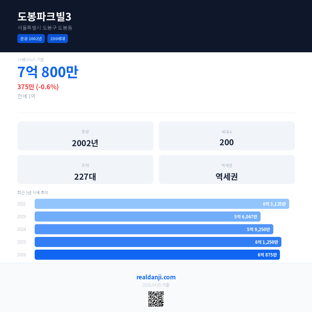 도봉파크빌3 국민평형 기준 2026년 평균 거래가는 6억 875만으로, 전년 대비 0.6% 하락 했습니다.
