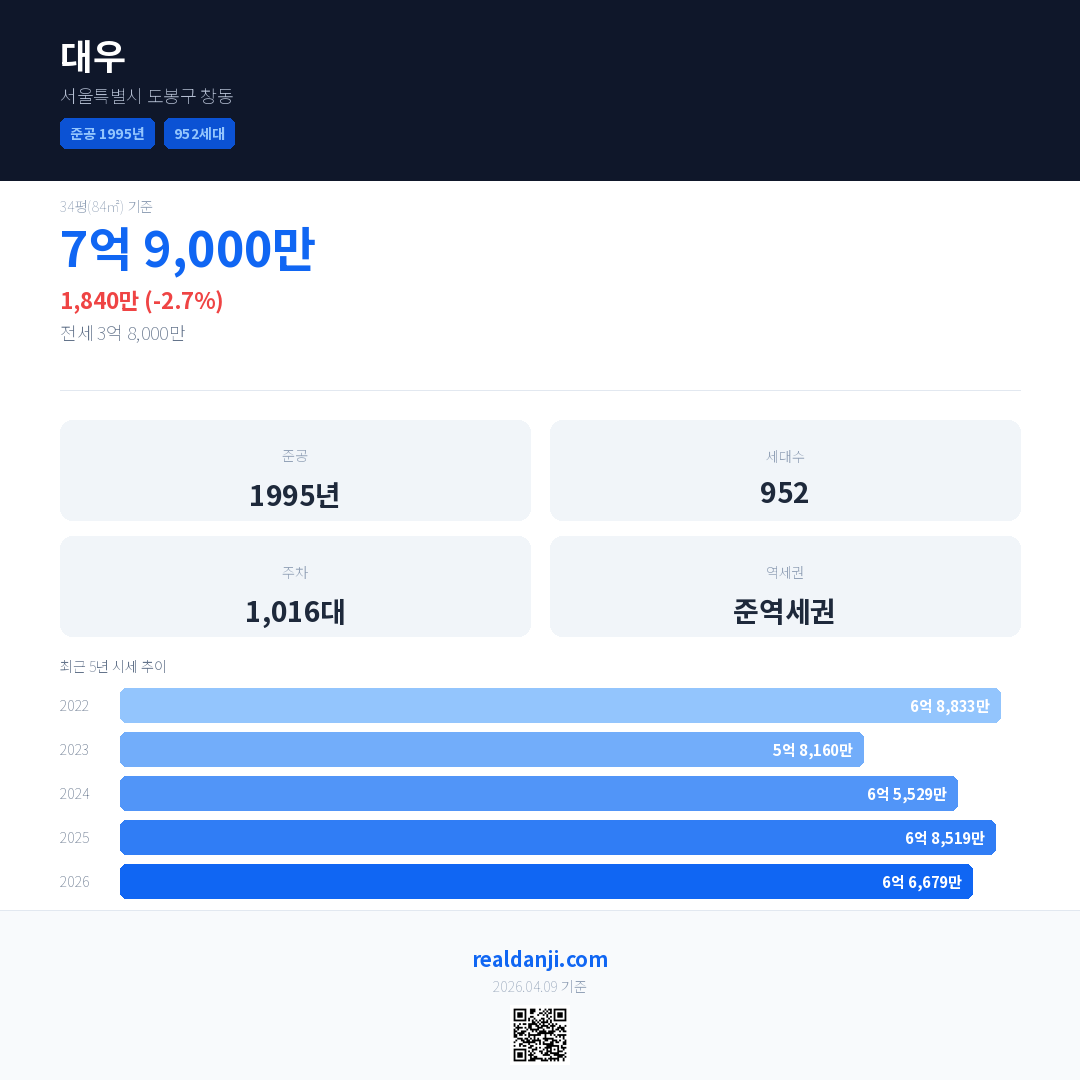 대우 국민평형 기준 2026년 평균 거래가는 6억 6,679만으로, 전년 대비 2.7% 하락 했습니다.