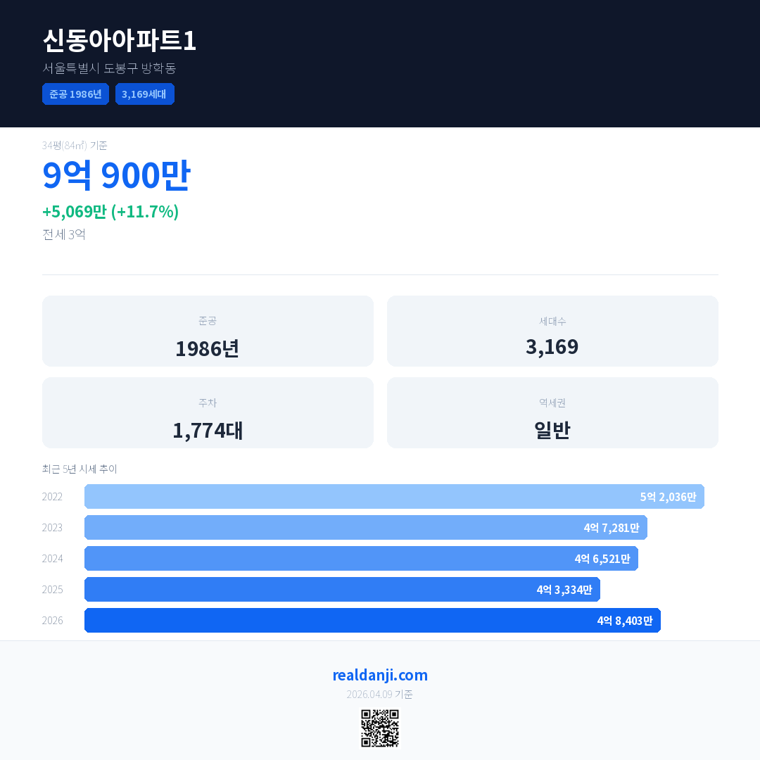 신동아아파트1 국민평형 기준 2026년 평균 거래가는 4억 8,403만으로, 전년 대비 11.7% 상승 했습니다.