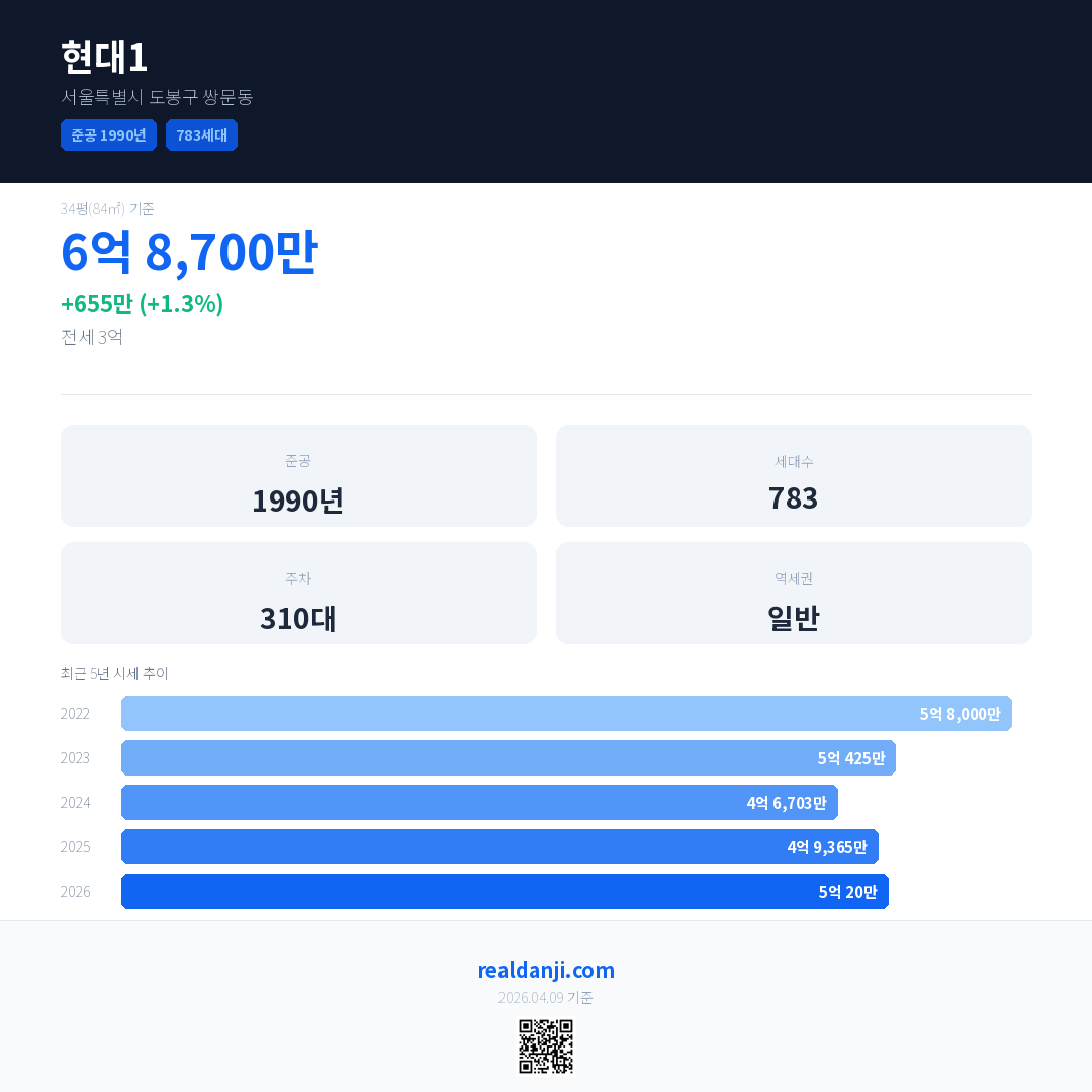 현대1 최근 거래가는 5억입니다. (2026-03)