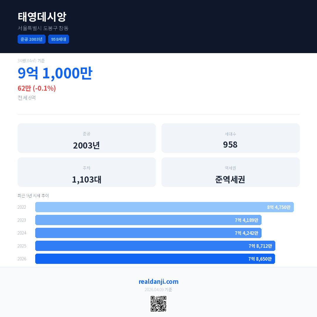 태영데시앙 국민평형 기준 2026년 평균 거래가는 7억 8,650만으로, 전년 대비 0.1% 하락 했습니다.