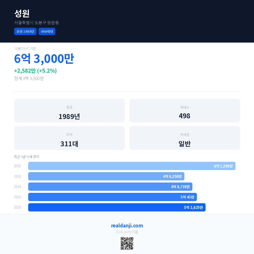 성원은(는) 1989년에 준공되었으며, 현재 37년차입니다. 총 498세대 규모입니다.