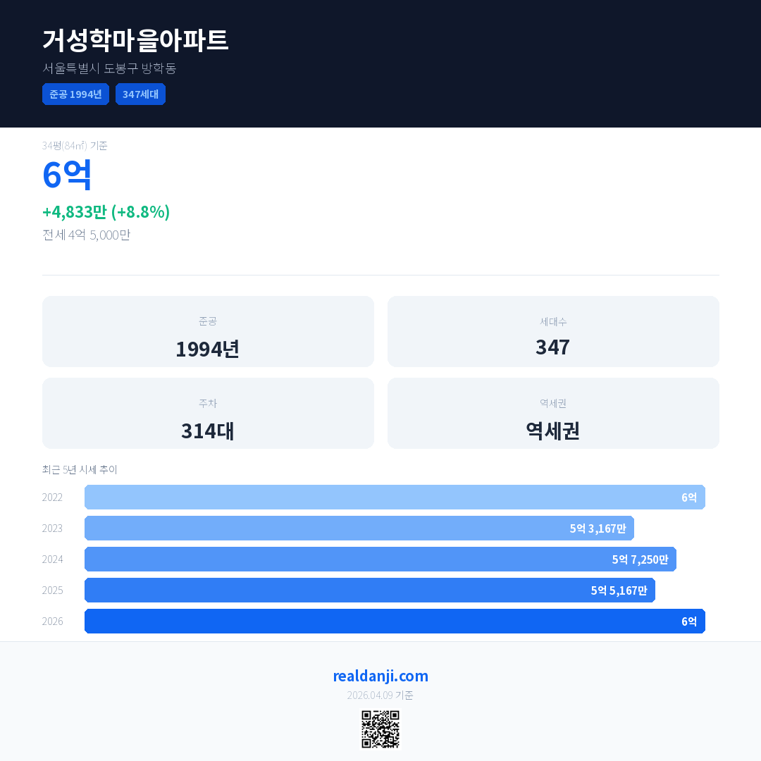 거성학마을아파트 국민평형 기준 2026년 평균 거래가는 6억으로, 전년 대비 8.8% 상승 했습니다.