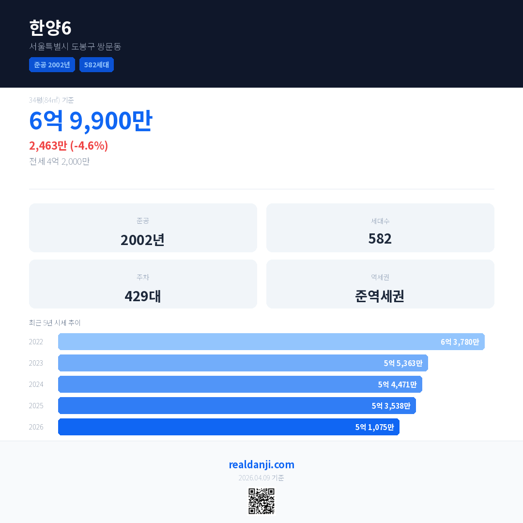 한양6 국민평형 기준 2026년 평균 거래가는 5억 1,075만으로, 전년 대비 4.6% 하락 했습니다.