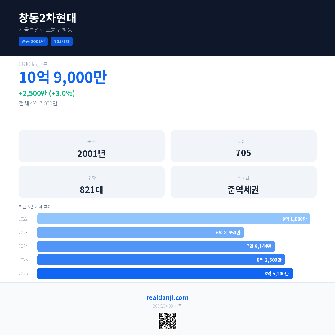 창동2차현대 국민평형 기준 2026년 평균 거래가는 8억 5,100만으로, 전년 대비 3.0% 상승 했습니다.