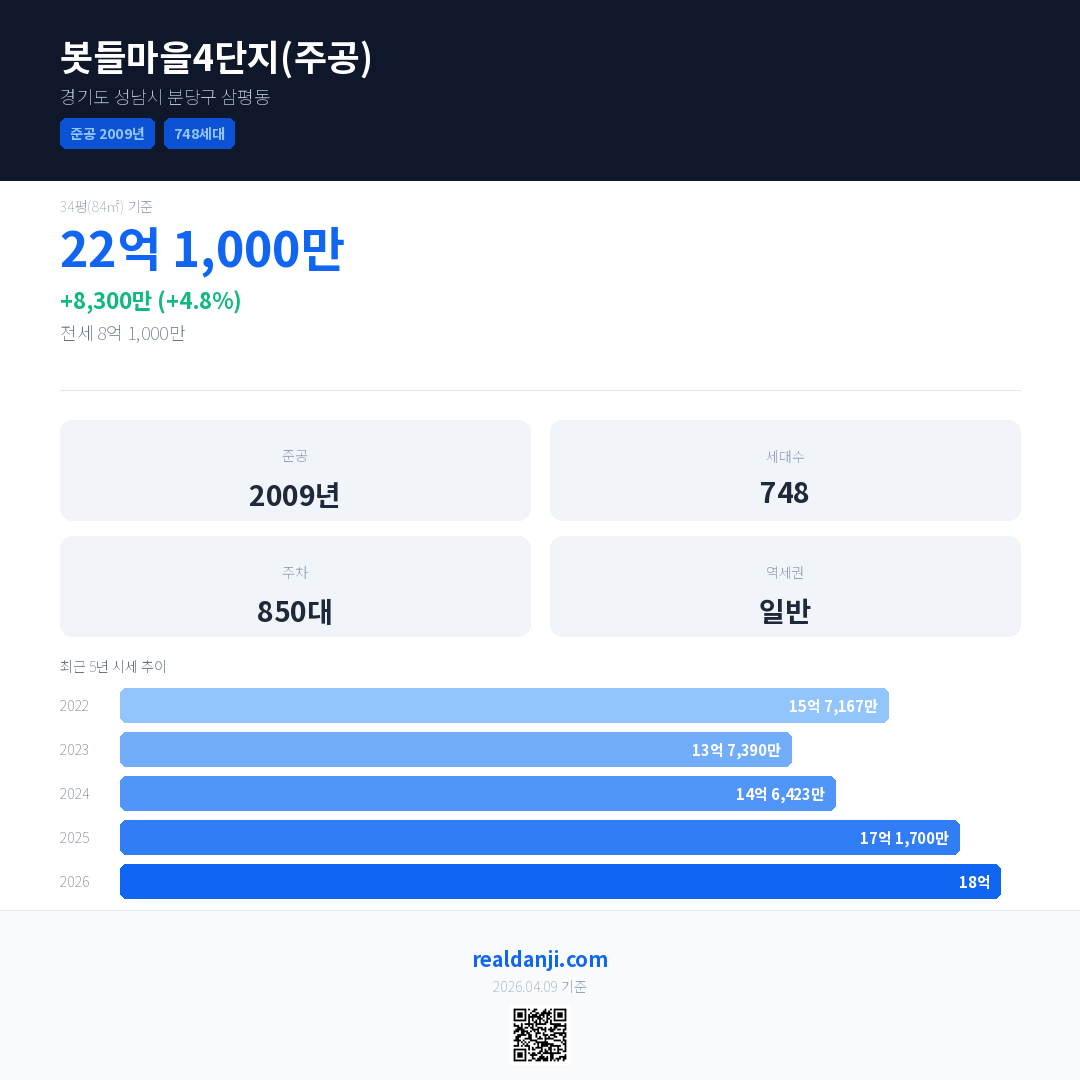 봇들마을4단지(주공) 국민평형 기준 2026년 평균 거래가는 18억으로, 전년 대비 4.8% 상승 했습니다.