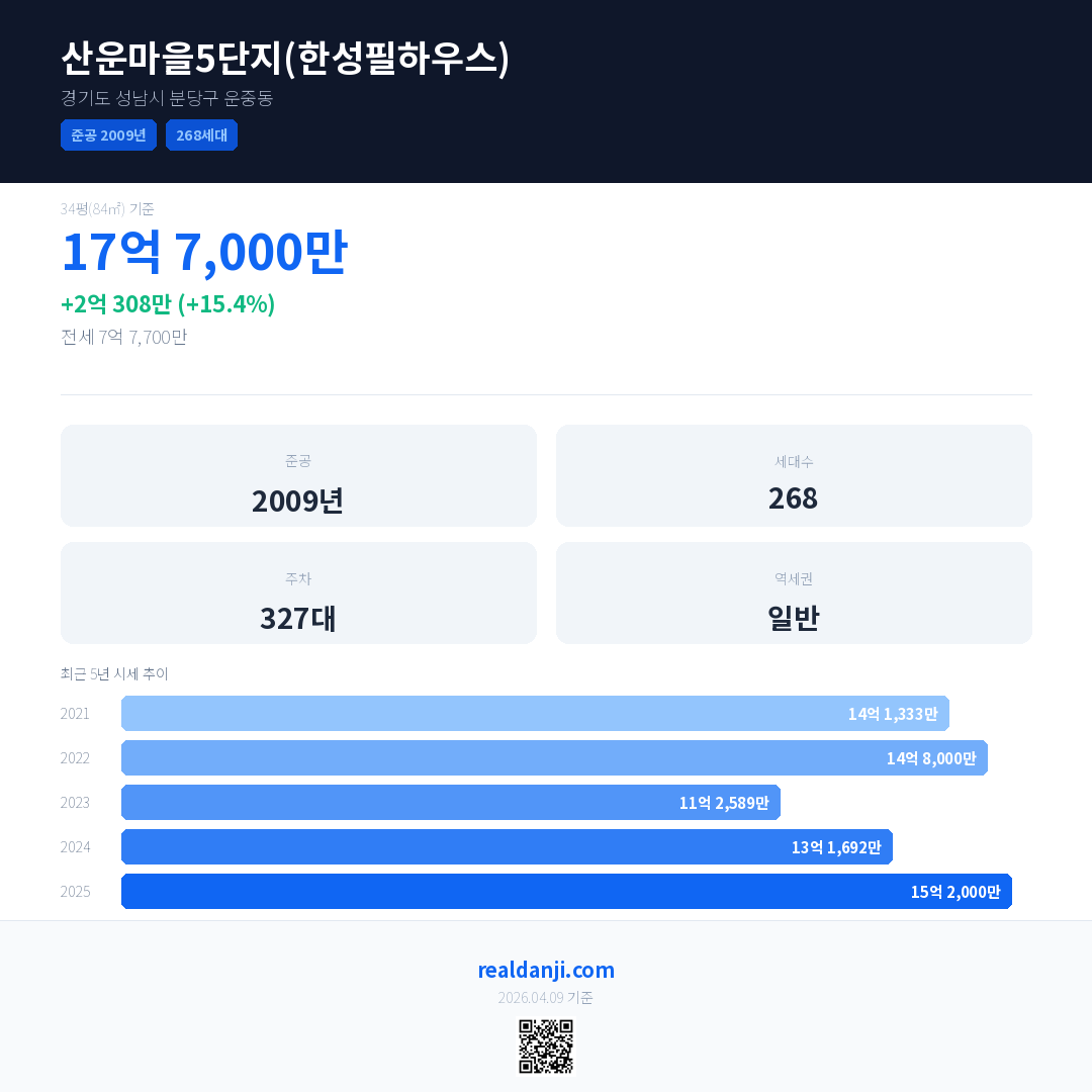 산운마을5단지(한성필하우스) 최근 거래가는 17억 7,000만입니다. (2025-10)