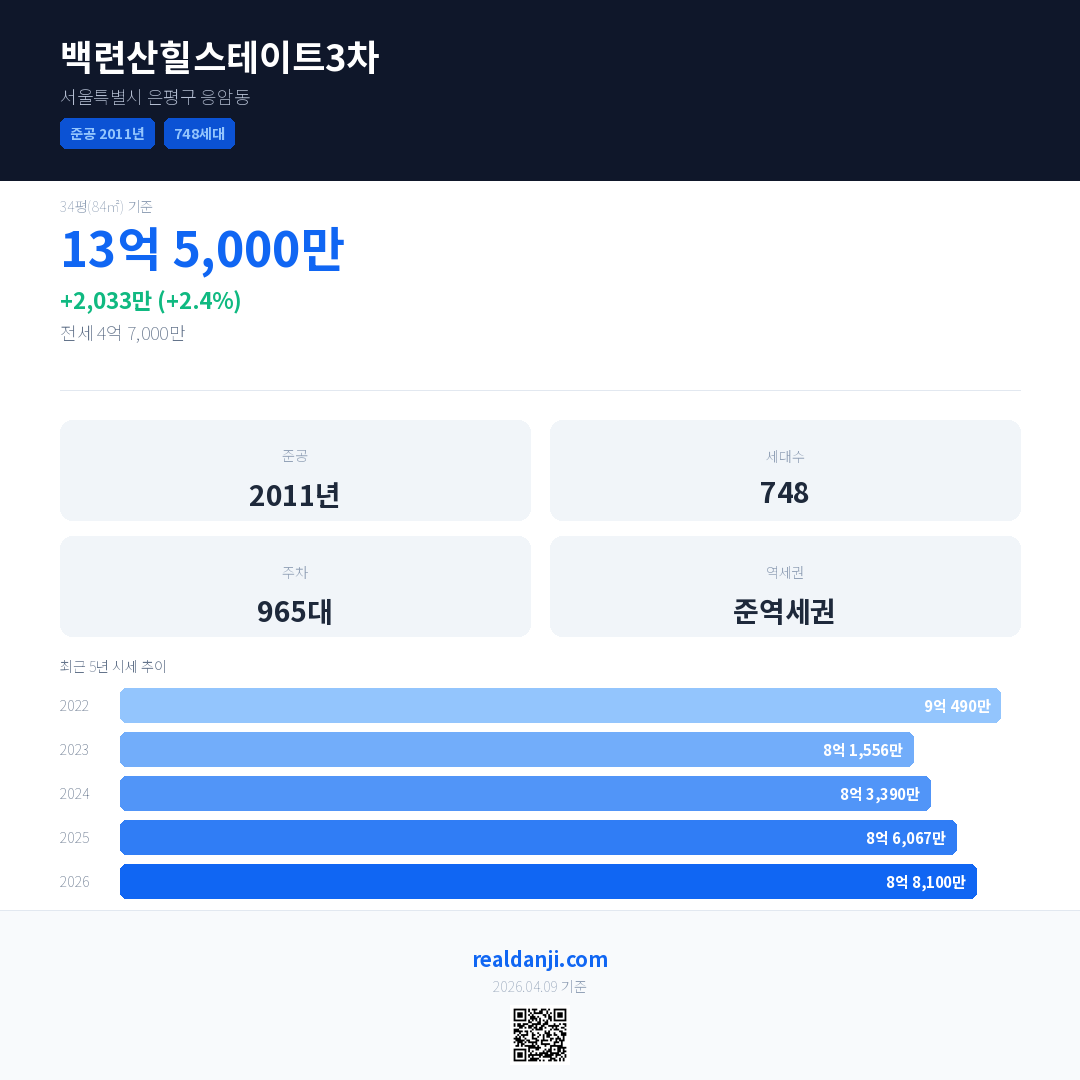 백련산힐스테이트3차 최근 거래가는 13억 5,000만입니다. (2026-03)