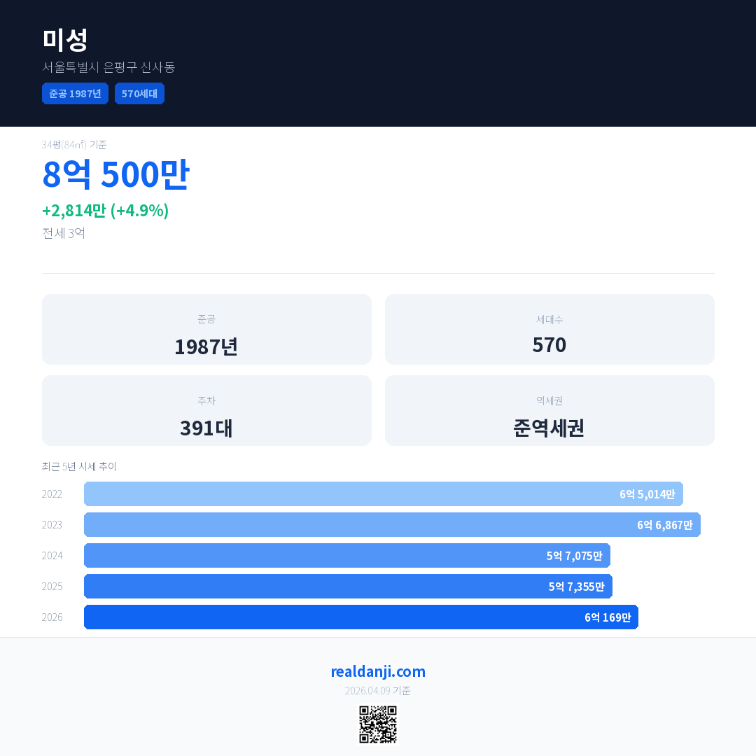 미성 국민평형 기준 2026년 평균 거래가는 6억 169만으로, 전년 대비 4.9% 상승 했습니다.