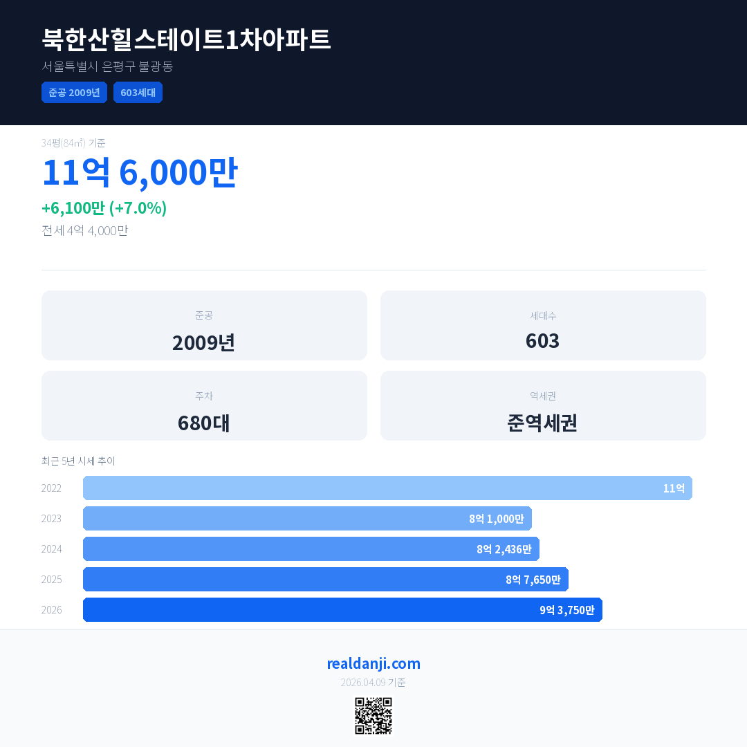 북한산힐스테이트1차아파트은(는) 2009년에 준공되었으며, 현재 17년차입니다. 총 603세대 규모입니다.