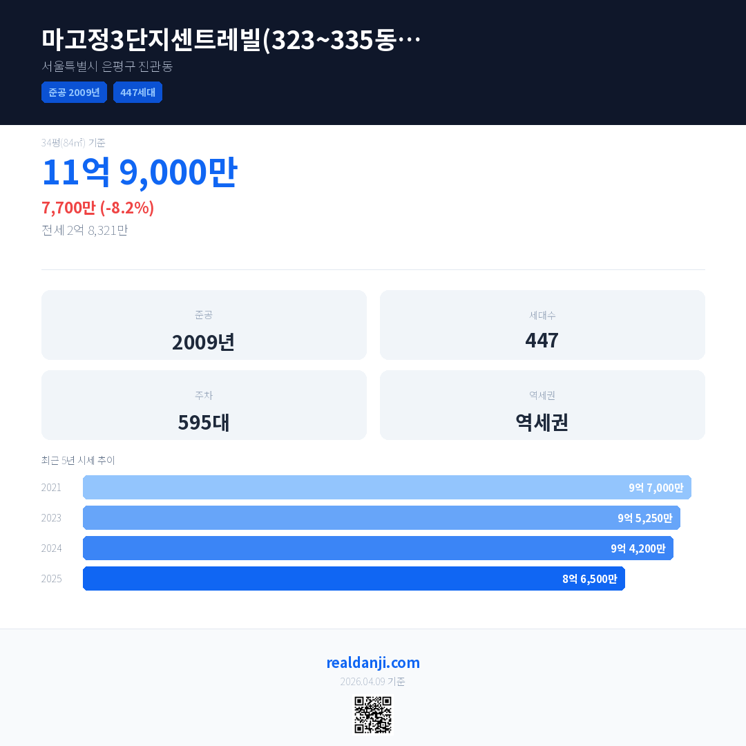 마고정3단지센트레빌(323~335동)BL2-2 국민평형 기준 2025년 평균 거래가는 8억 6,500만으로, 전년 대비 8.2% 하락 했습니다.