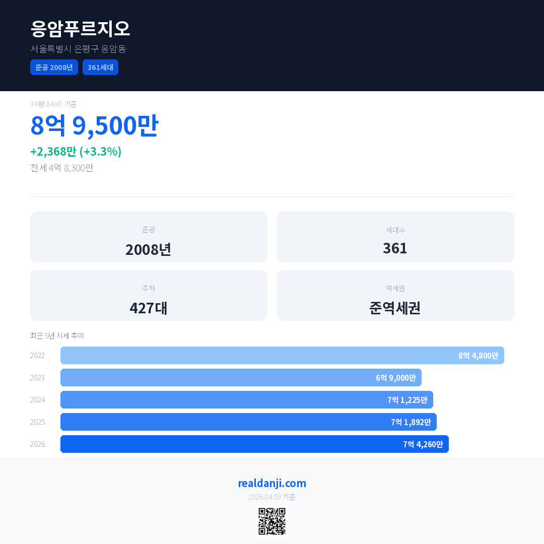 응암푸르지오 최근 거래가는 8억 9,500만입니다. (2026-03)