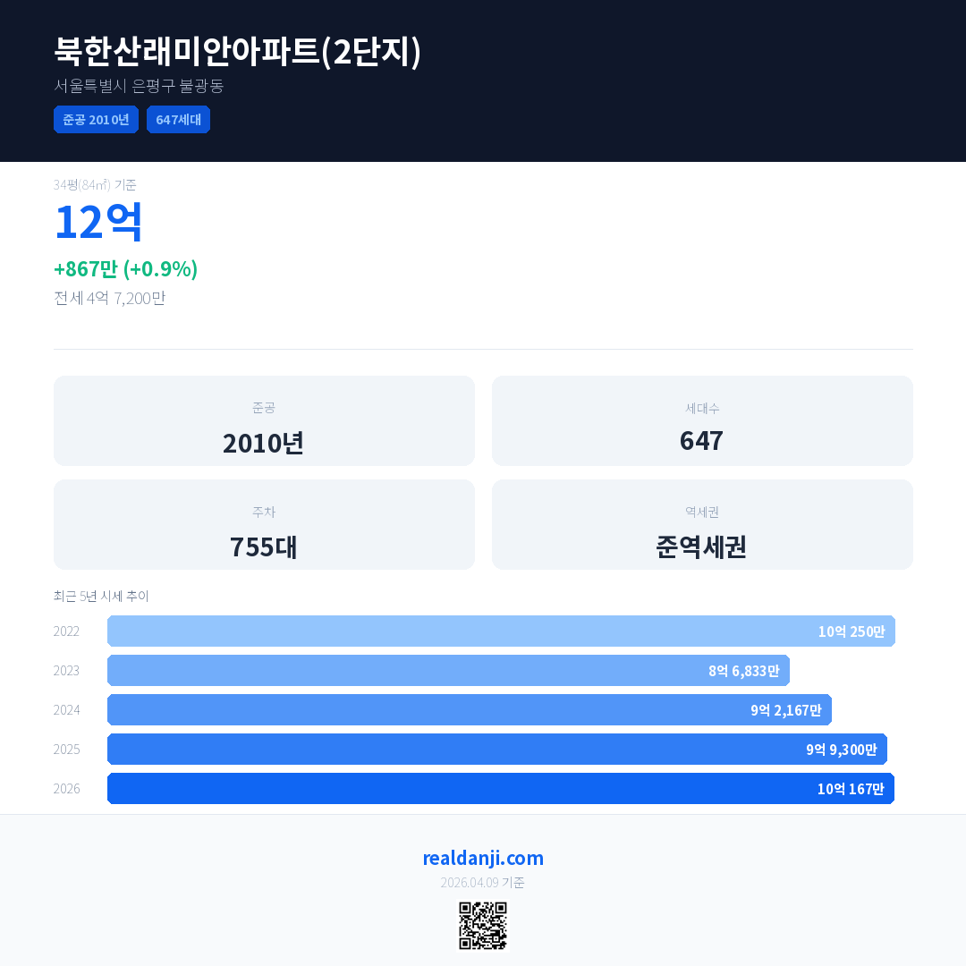 북한산래미안아파트(2단지) 국민평형 기준 2026년 평균 거래가는 10억 167만으로, 전년 대비 0.9% 상승 했습니다.