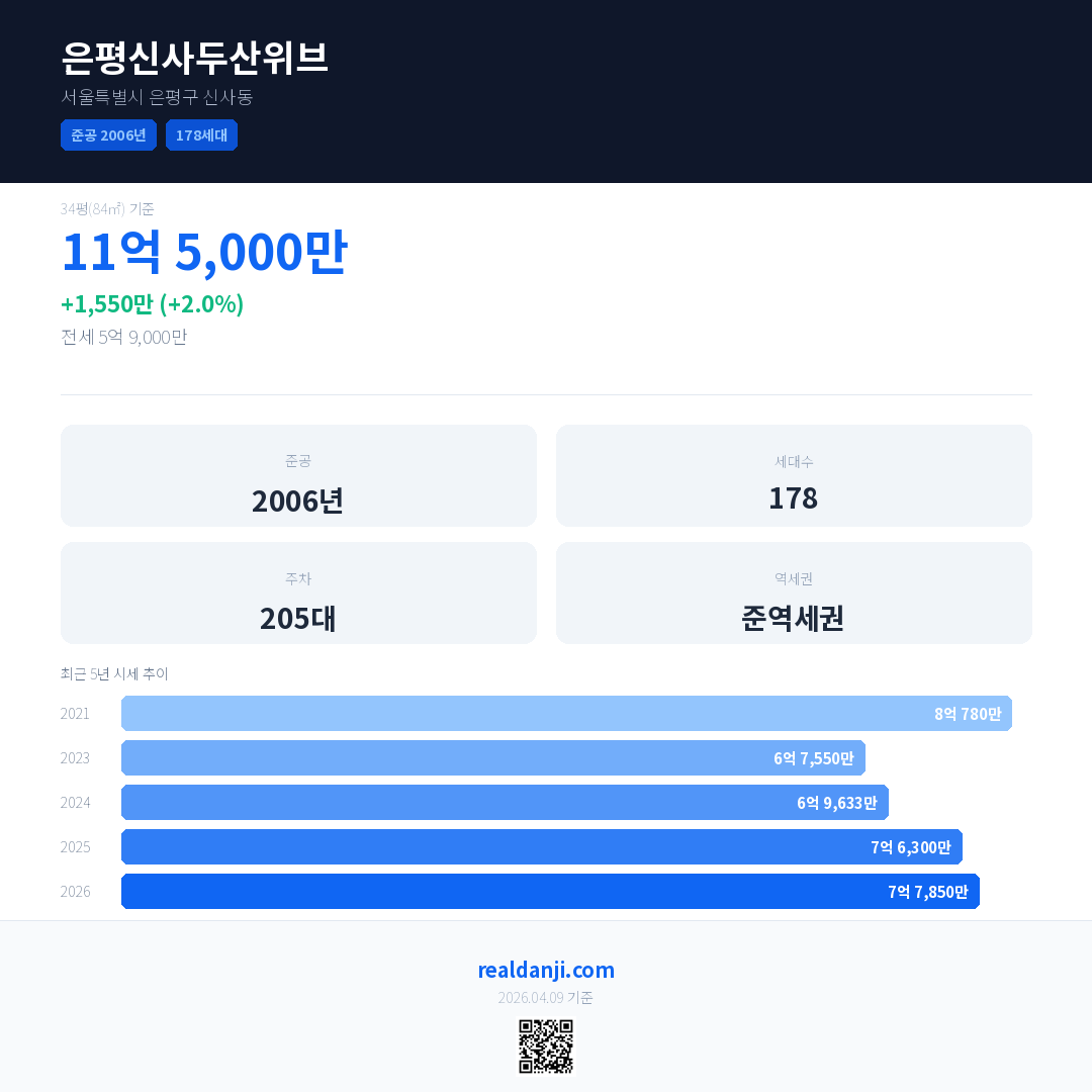 은평신사두산위브 최근 거래가는 11억 5,000만입니다. (2026-03)