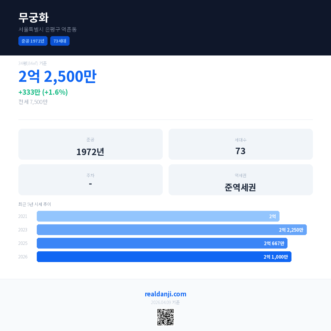 무궁화 국민평형 기준 2026년 평균 거래가는 2억 1,000만으로, 전년 대비 1.6% 상승 했습니다.