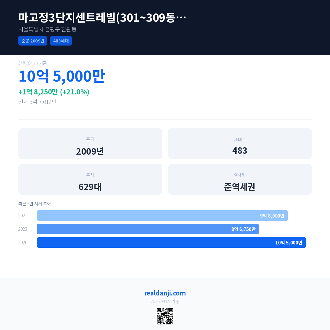 마고정3단지센트레빌(301~309동)BL2-11 국민평형 기준 2026년 평균 거래가는 10억 5,000만으로, 전년 대비 21.0% 상승 했습니다.