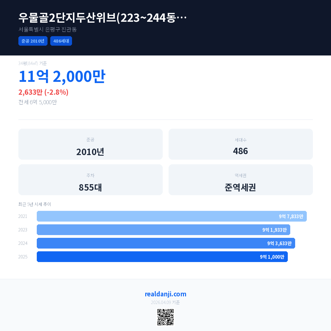 우물골2단지두산위브(223~244동)BL2-7 국민평형 기준 2025년 평균 거래가는 9억 1,000만으로, 전년 대비 2.8% 하락 했습니다.
