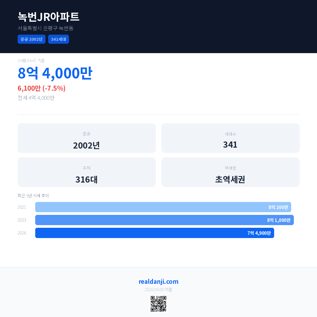 녹번JR아파트 최근 거래가는 8억 4,000만입니다. (2026-03)