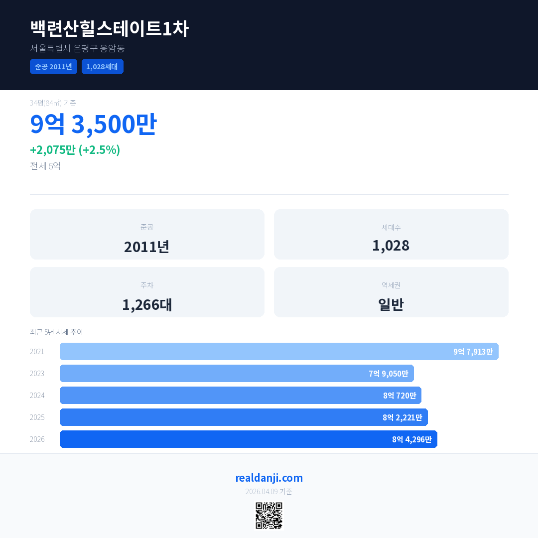 백련산힐스테이트1차은(는) 2011년에 준공되었으며, 현재 15년차입니다. 총 1,028세대 규모입니다.