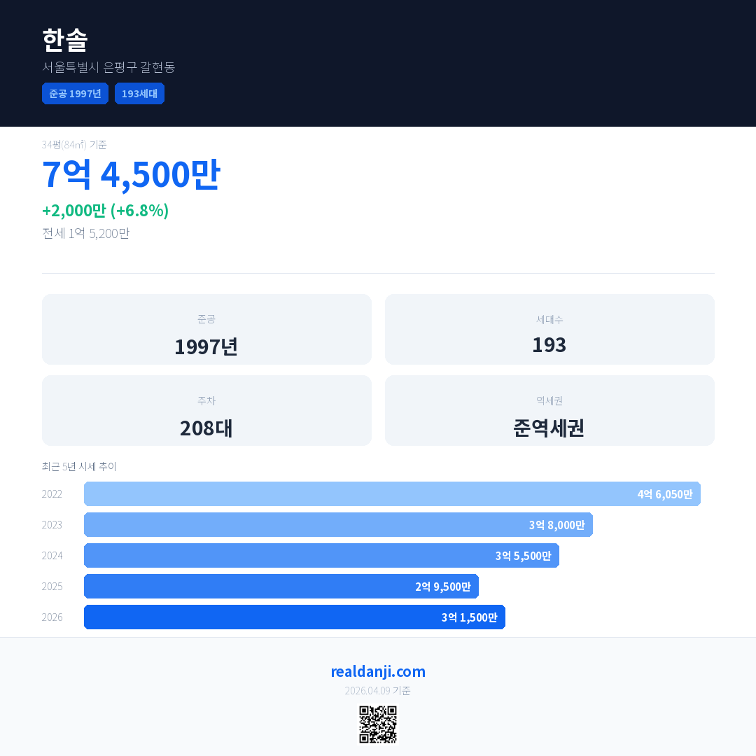 한솔은(는) 1997년에 준공되었으며, 현재 29년차입니다. 총 193세대 규모입니다.