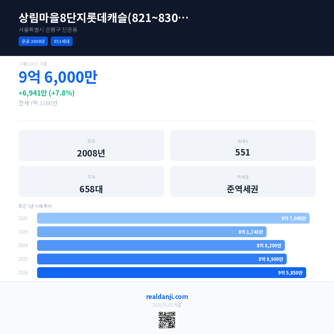 상림마을8단지롯데캐슬(821~830동)BL1-12 국민평형 기준 2026년 평균 거래가는 9억 5,850만으로, 전년 대비 7.8% 상승 했습니다.