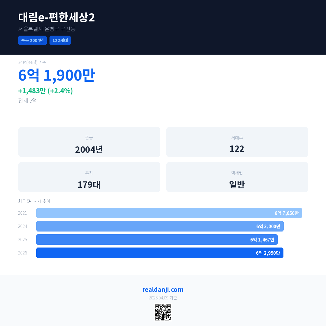 대림e-편한세상2 국민평형 기준 2026년 평균 거래가는 6억 2,950만으로, 전년 대비 2.4% 상승 했습니다.