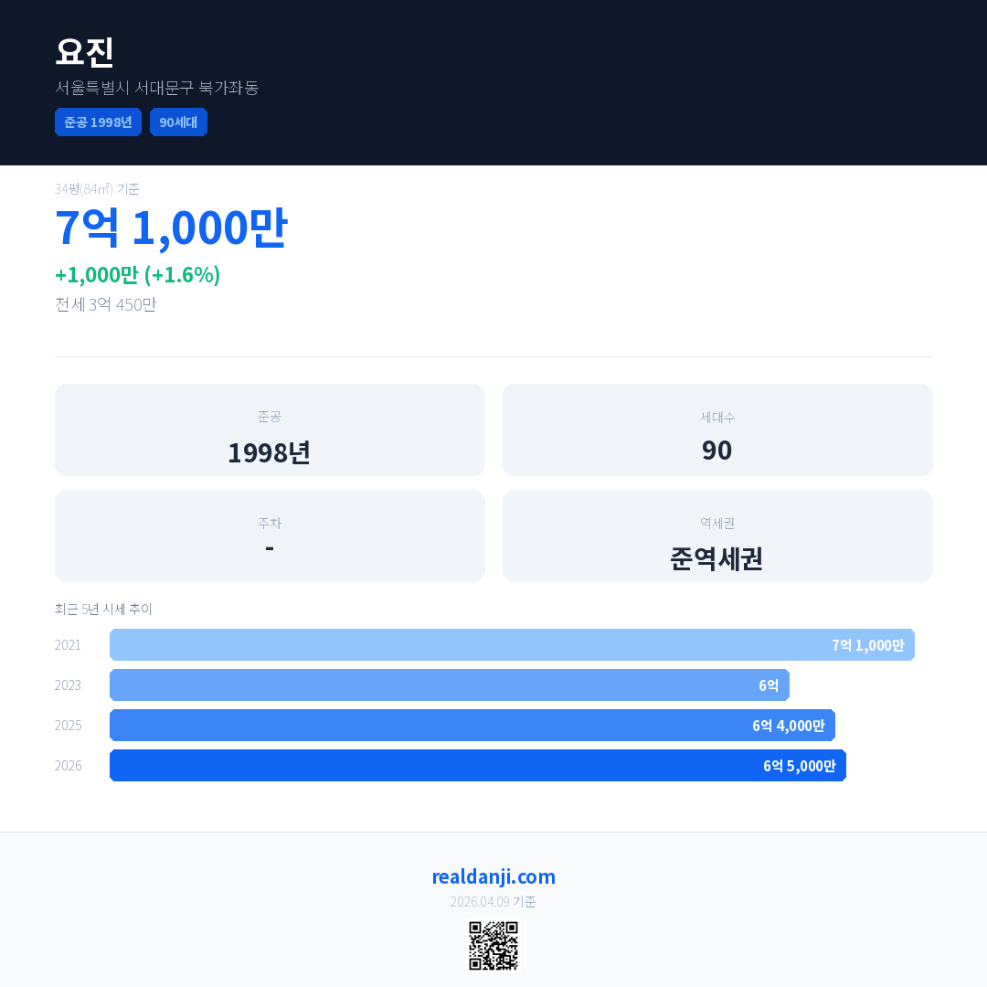 요진 국민평형 기준 2026년 평균 거래가는 6억 5,000만으로, 전년 대비 1.6% 상승 했습니다.