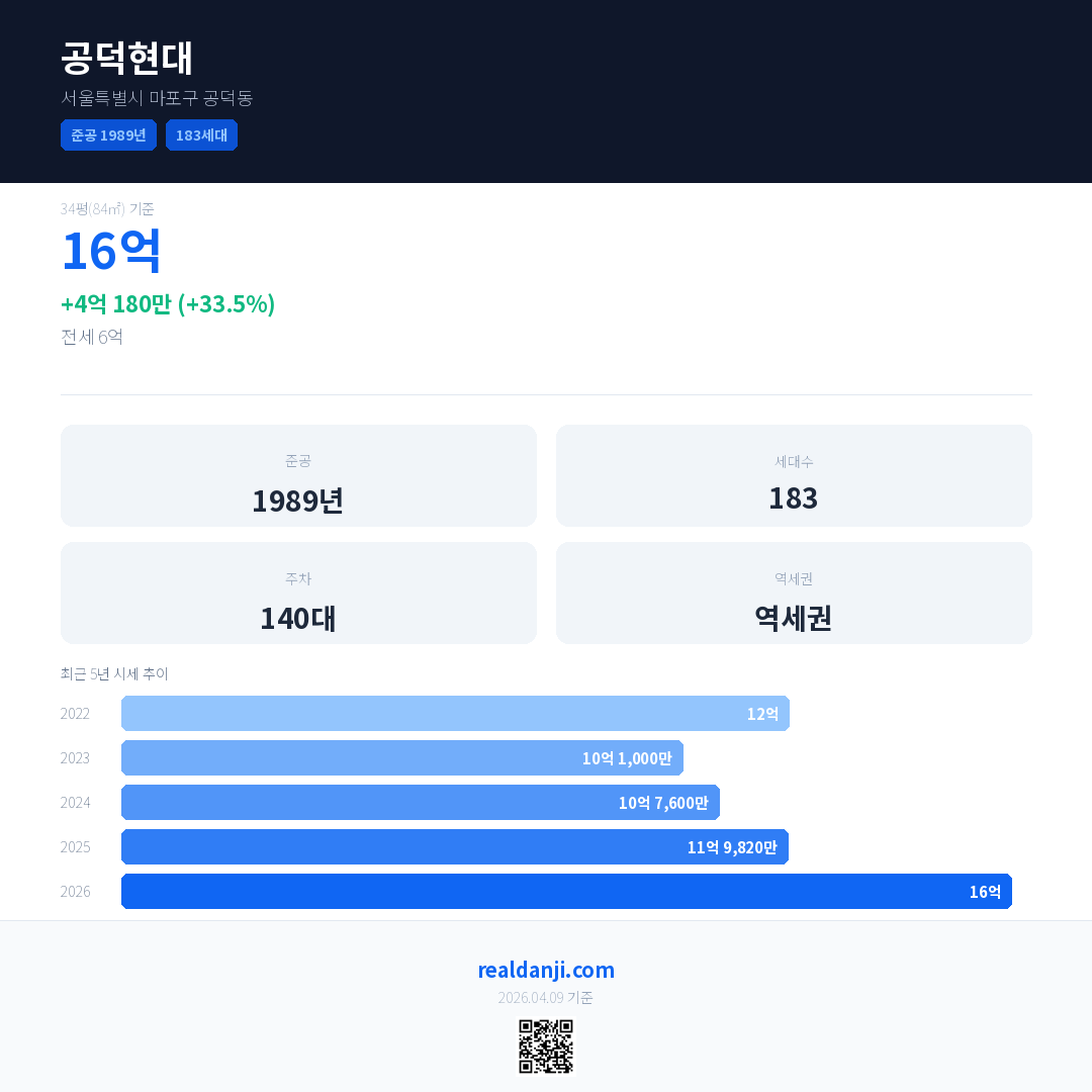 공덕현대 최근 거래가는 16억입니다. (2026-02)