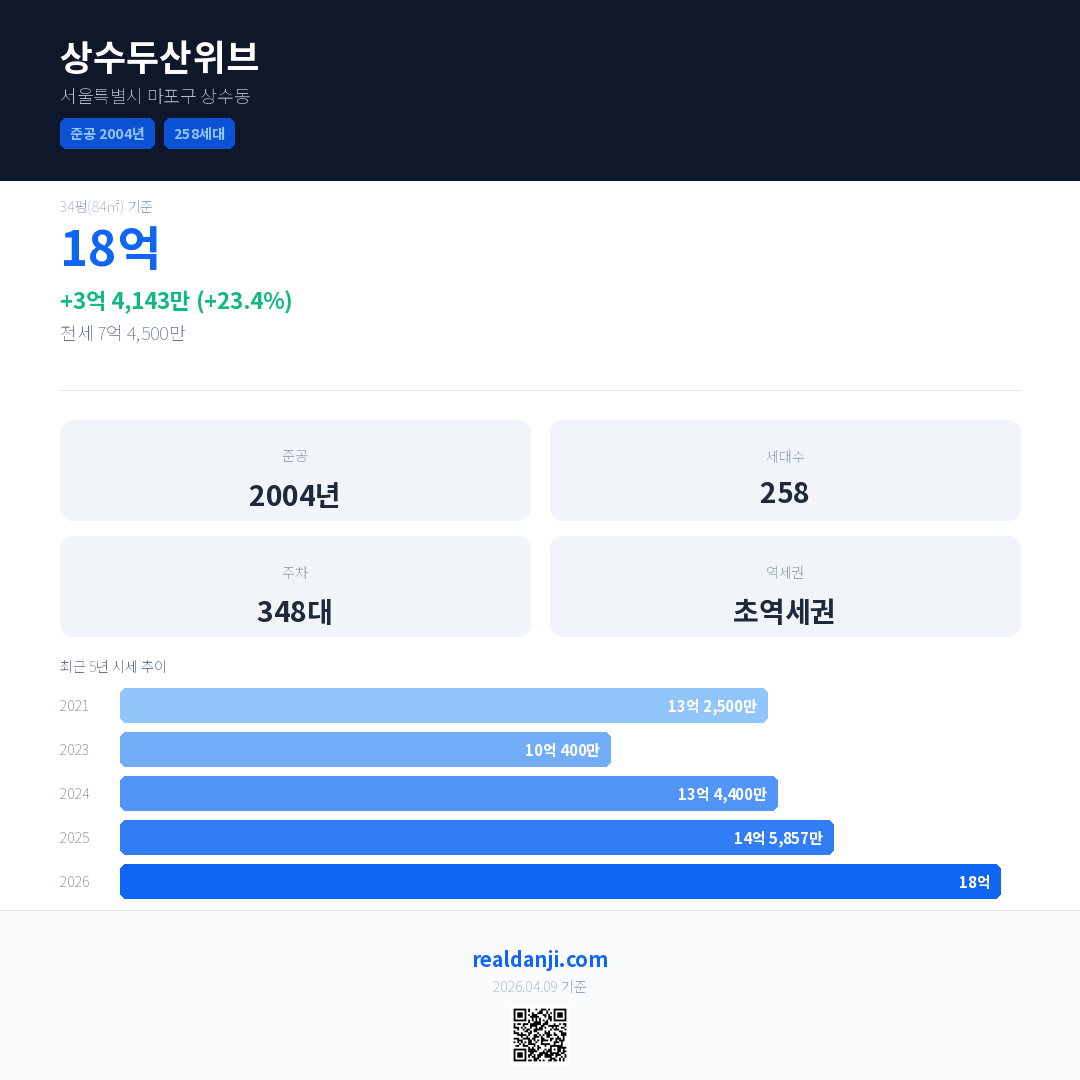 상수두산위브 국민평형 기준 2026년 평균 거래가는 18억으로, 전년 대비 23.4% 상승 했습니다.