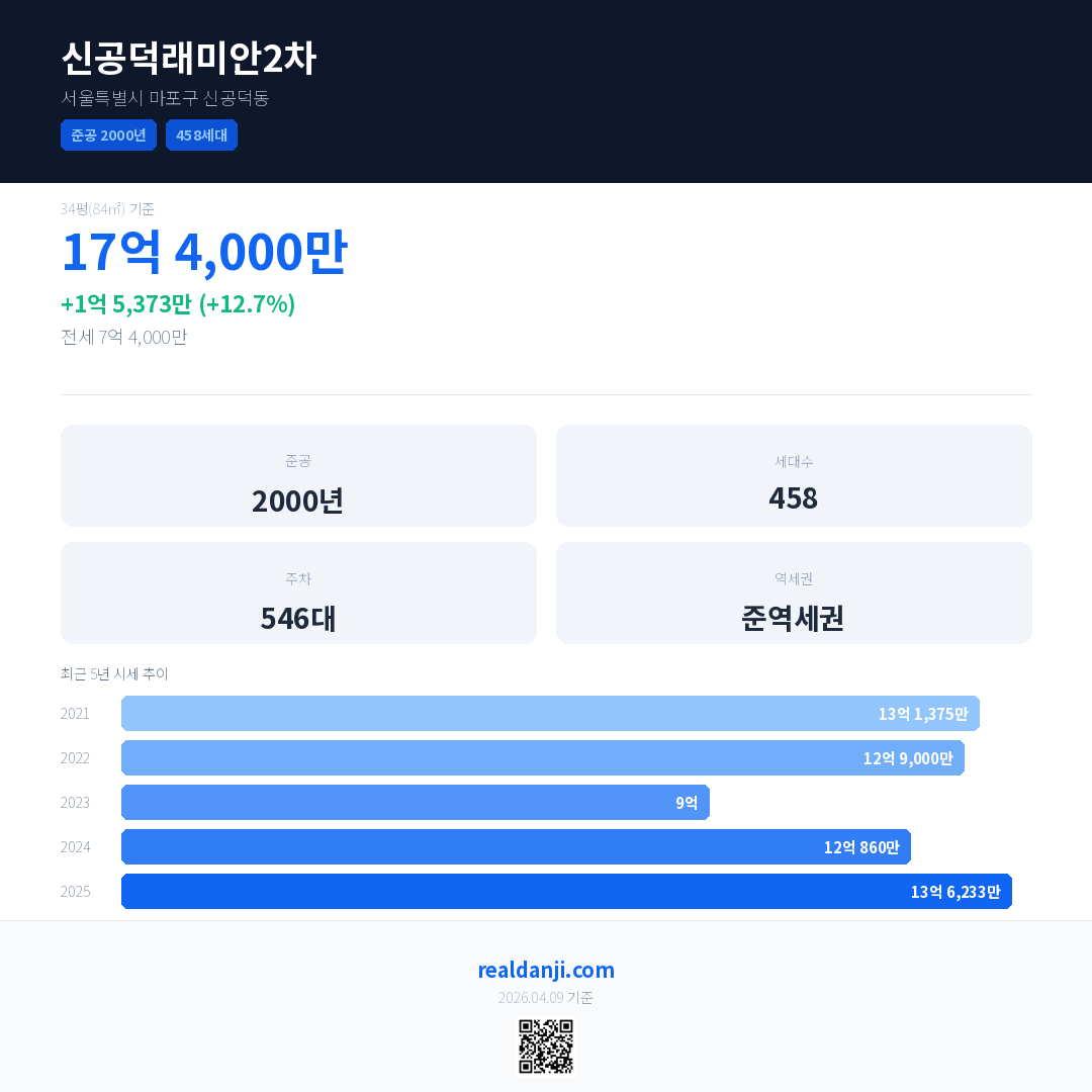 신공덕래미안2차 최근 거래가는 17억 4,000만입니다. (2026-03)