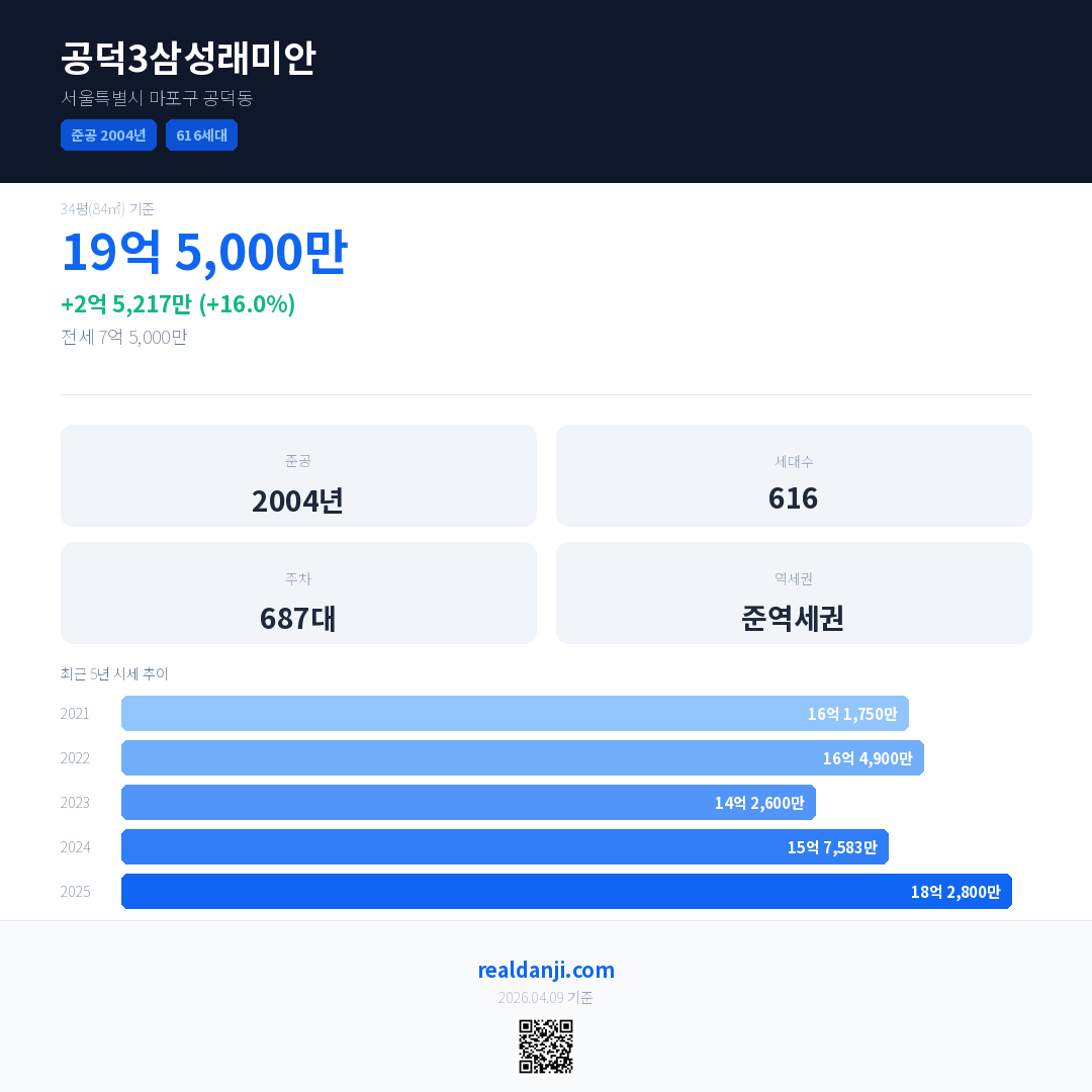 공덕3삼성래미안은(는) 2004년에 준공되었으며, 현재 22년차입니다. 총 616세대 규모입니다.