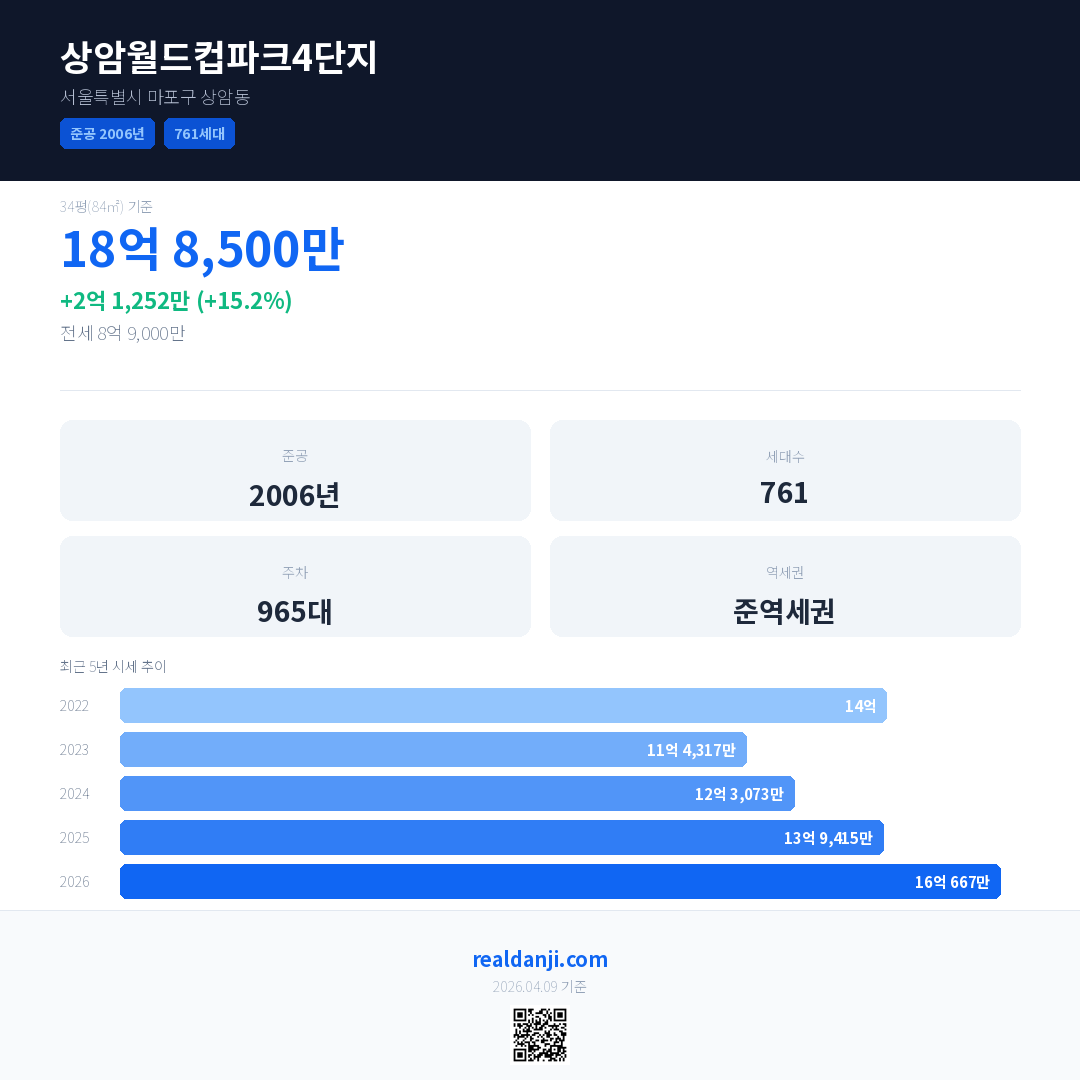 상암월드컵파크4단지 국민평형 기준 2026년 평균 거래가는 16억 667만으로, 전년 대비 15.2% 상승 했습니다.