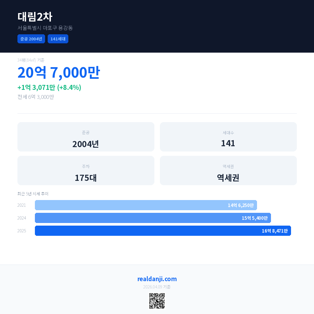 대림2차 국민평형 기준 2025년 평균 거래가는 16억 8,471만으로, 전년 대비 8.4% 상승 했습니다.