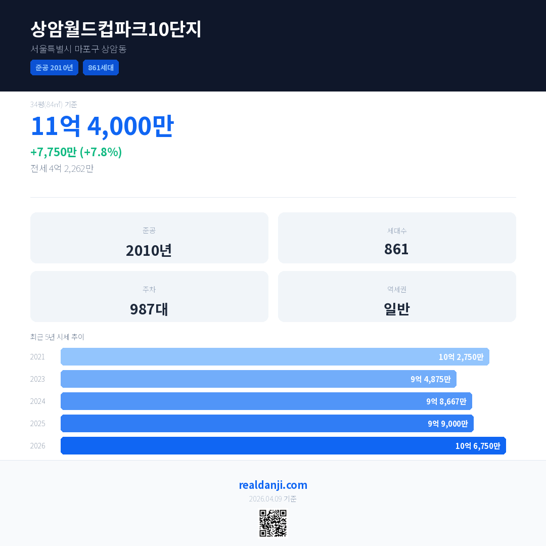 상암월드컵파크10단지 최근 거래가는 11억 4,000만입니다. (2026-03)
