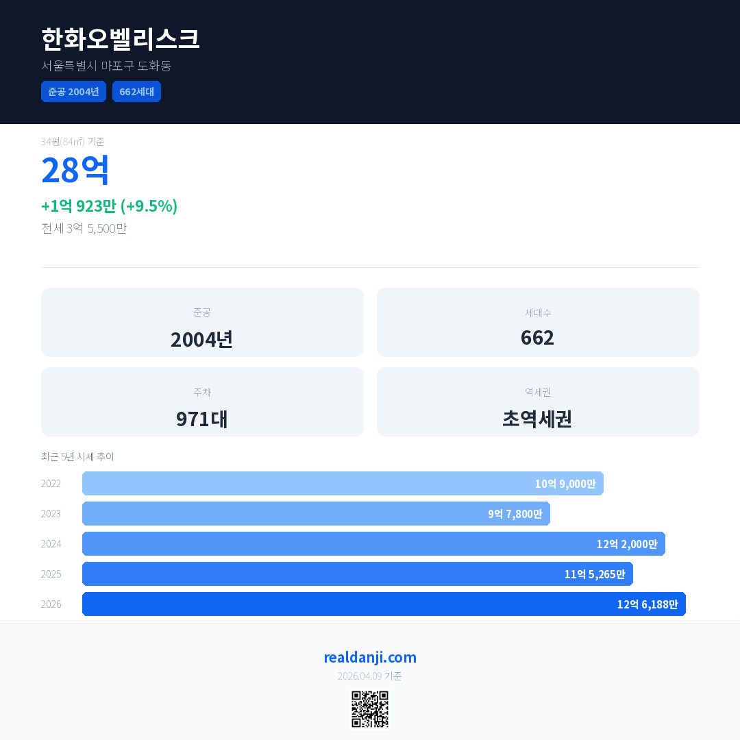 한화오벨리스크 국민평형 기준 2026년 평균 거래가는 12억 6,188만으로, 전년 대비 9.5% 상승 했습니다.