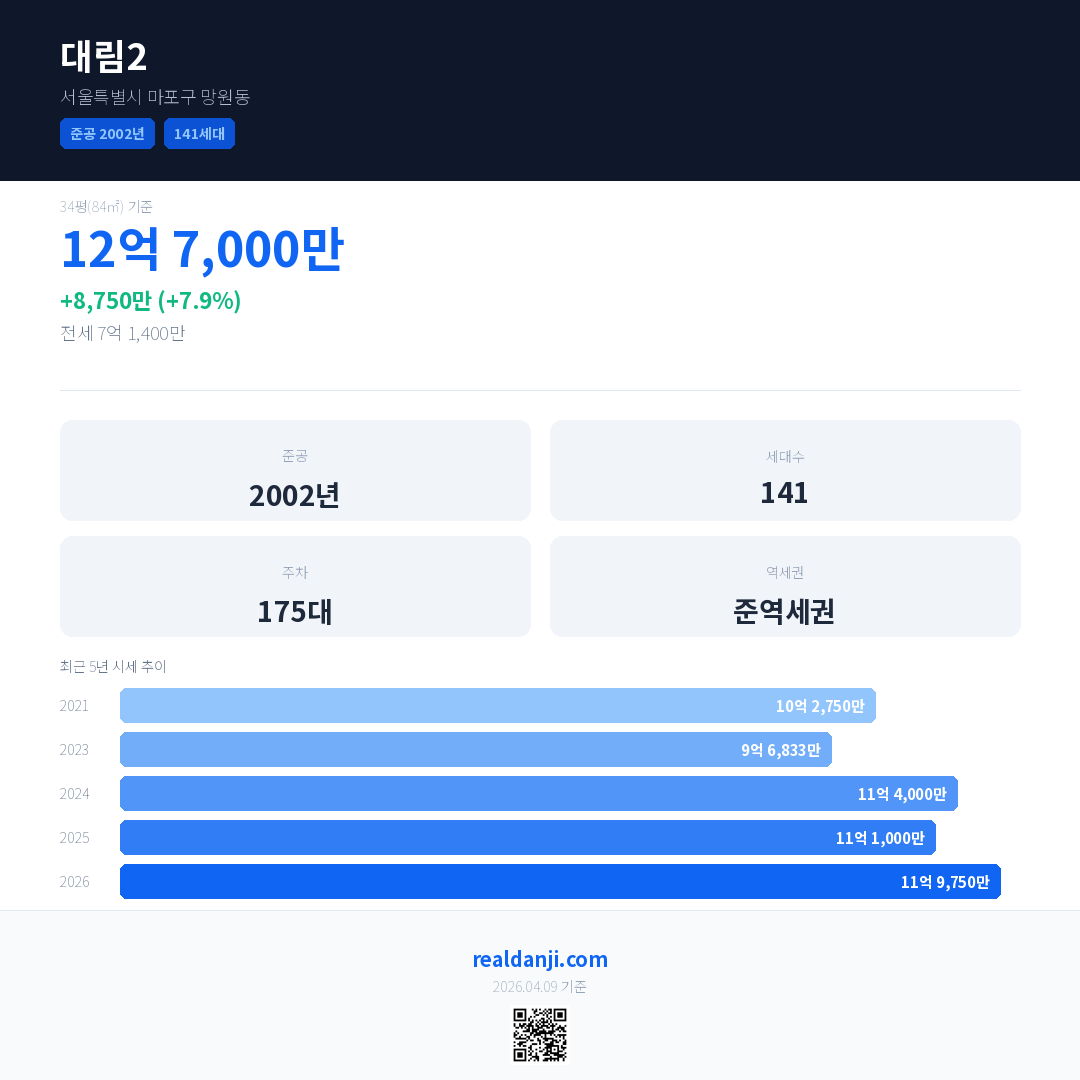 대림2 국민평형 기준 2026년 평균 거래가는 11억 9,750만으로, 전년 대비 7.9% 상승 했습니다.