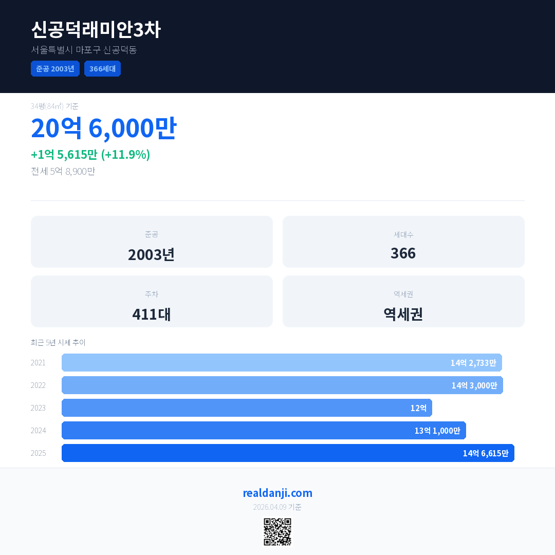 신공덕래미안3차 최근 거래가는 20억 6,000만입니다. (2026-01)