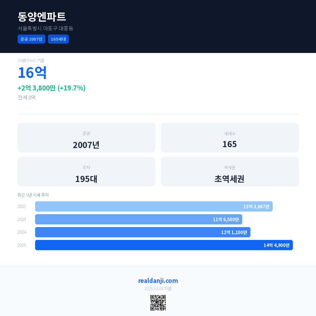 동양엔파트 최근 거래가는 16억입니다. (2025-06)