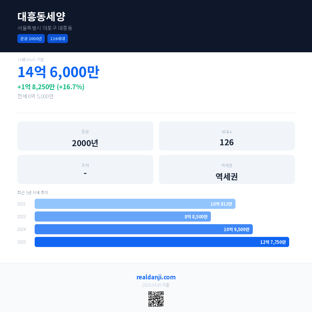 대흥동세양 국민평형 기준 2025년 평균 거래가는 12억 7,750만으로, 전년 대비 16.7% 상승 했습니다.